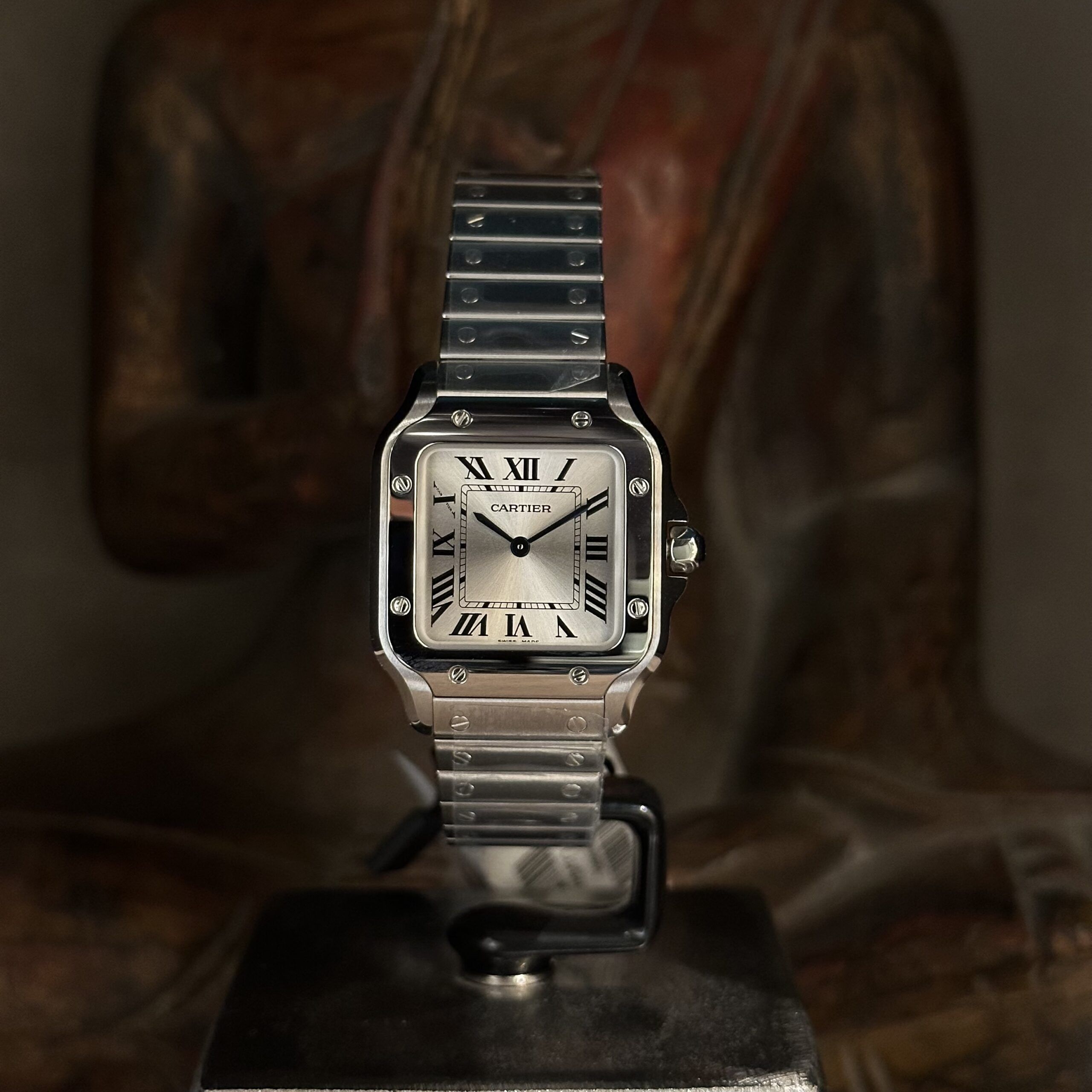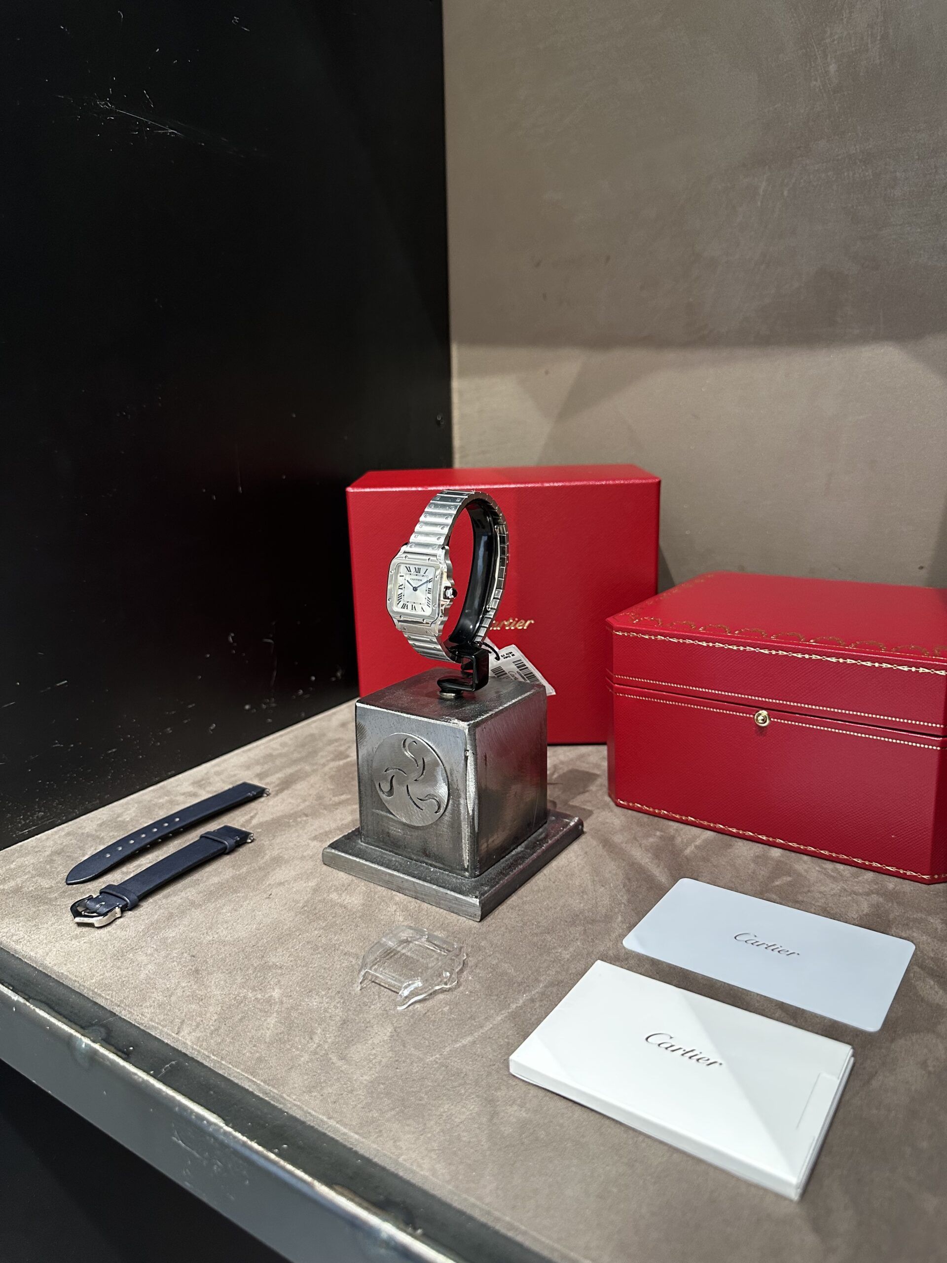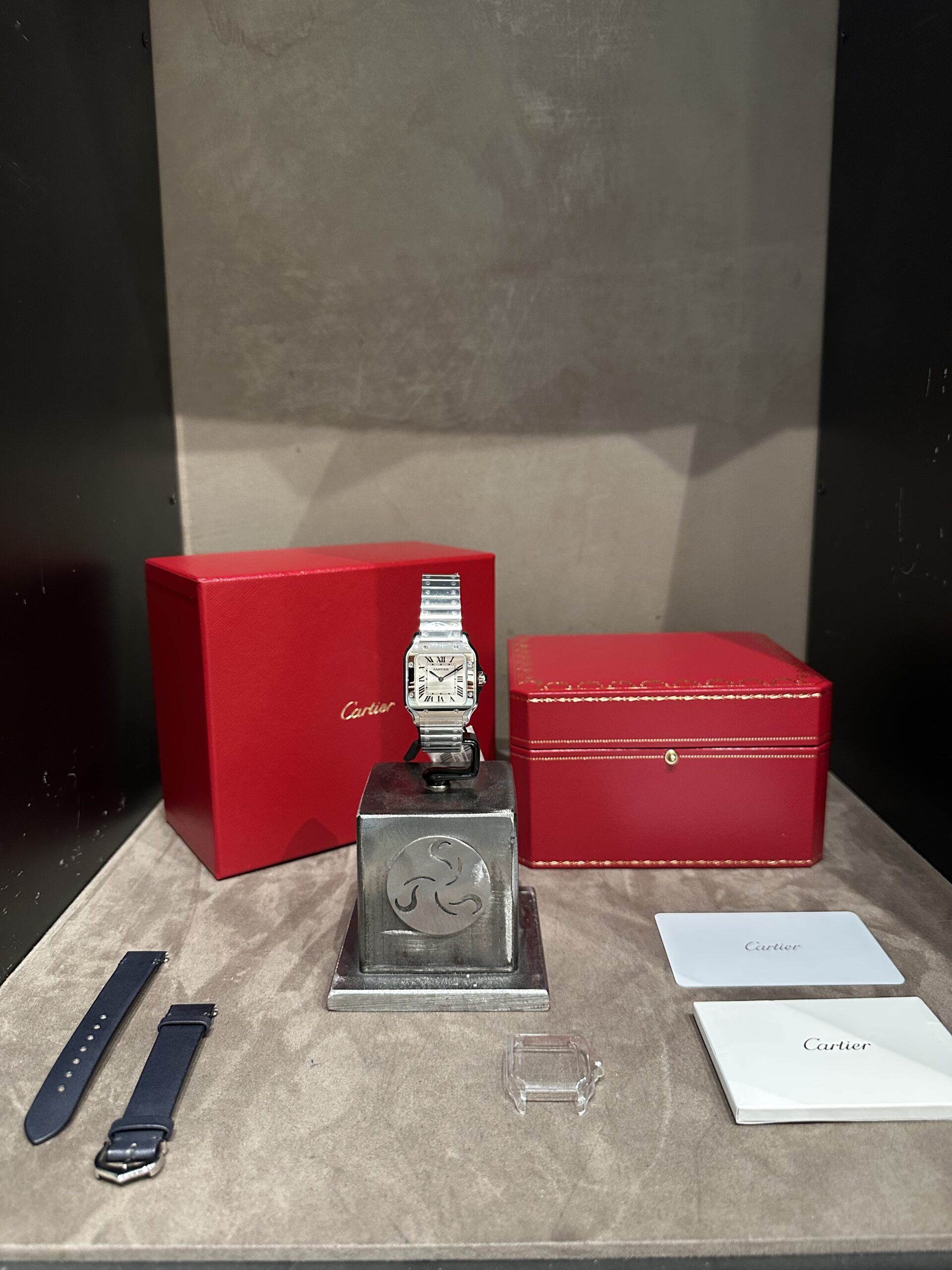 Stupendo Cartier Santos, Ref. WSSA0082, nuovo, taglia piccola, movimento al quarzo, doppio bracciale acciaio e pelle blu, full set.