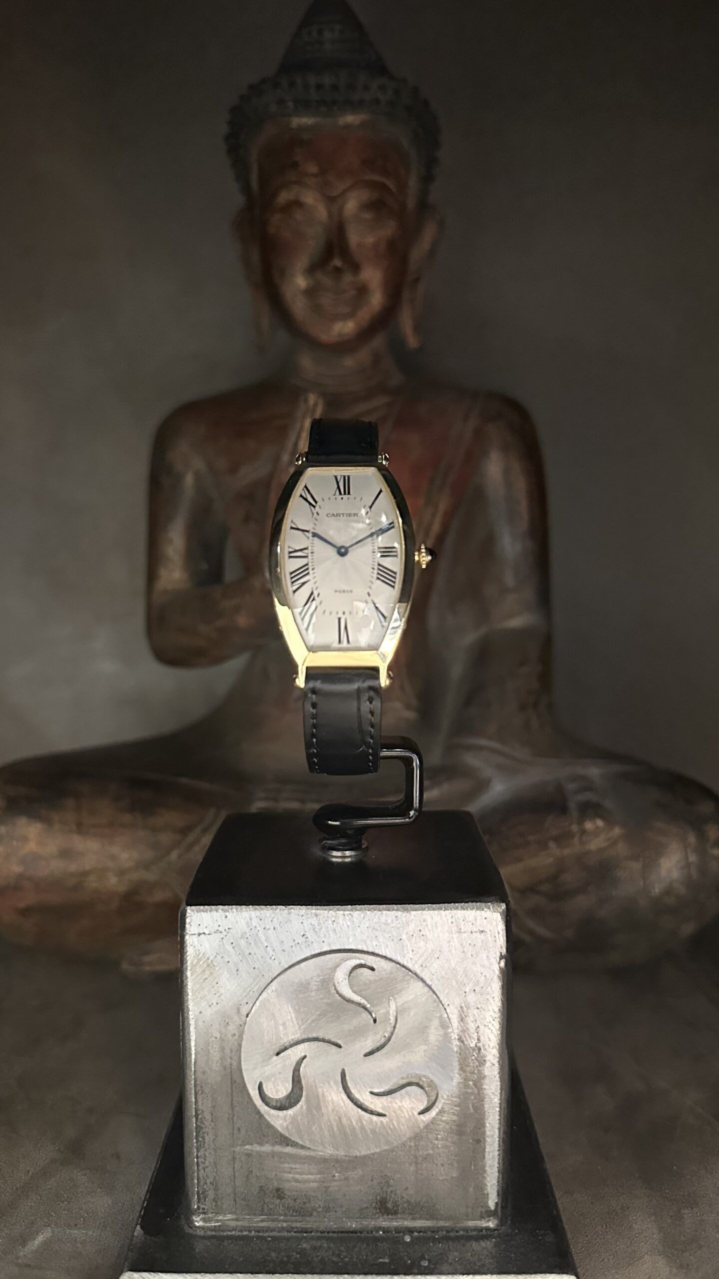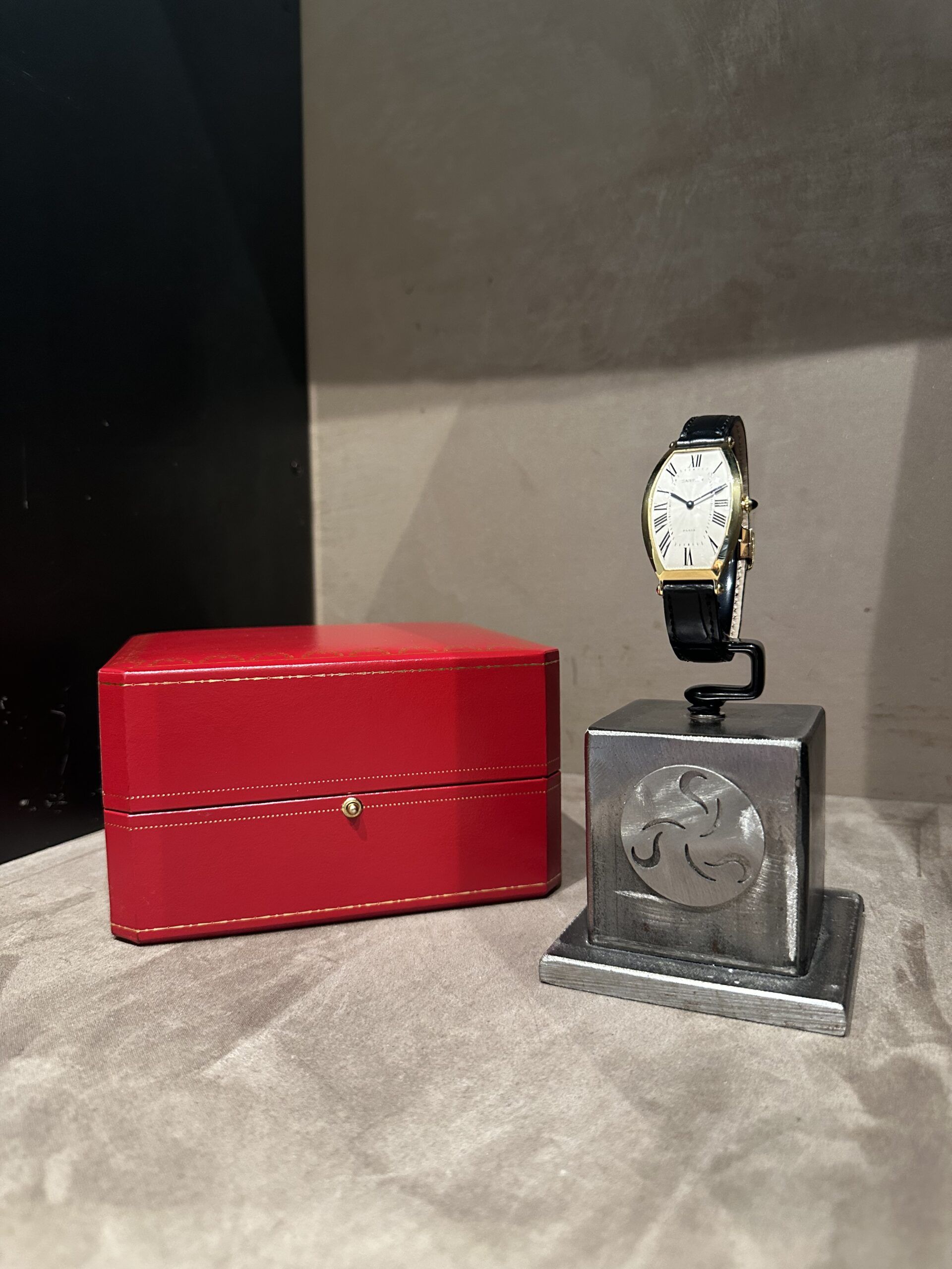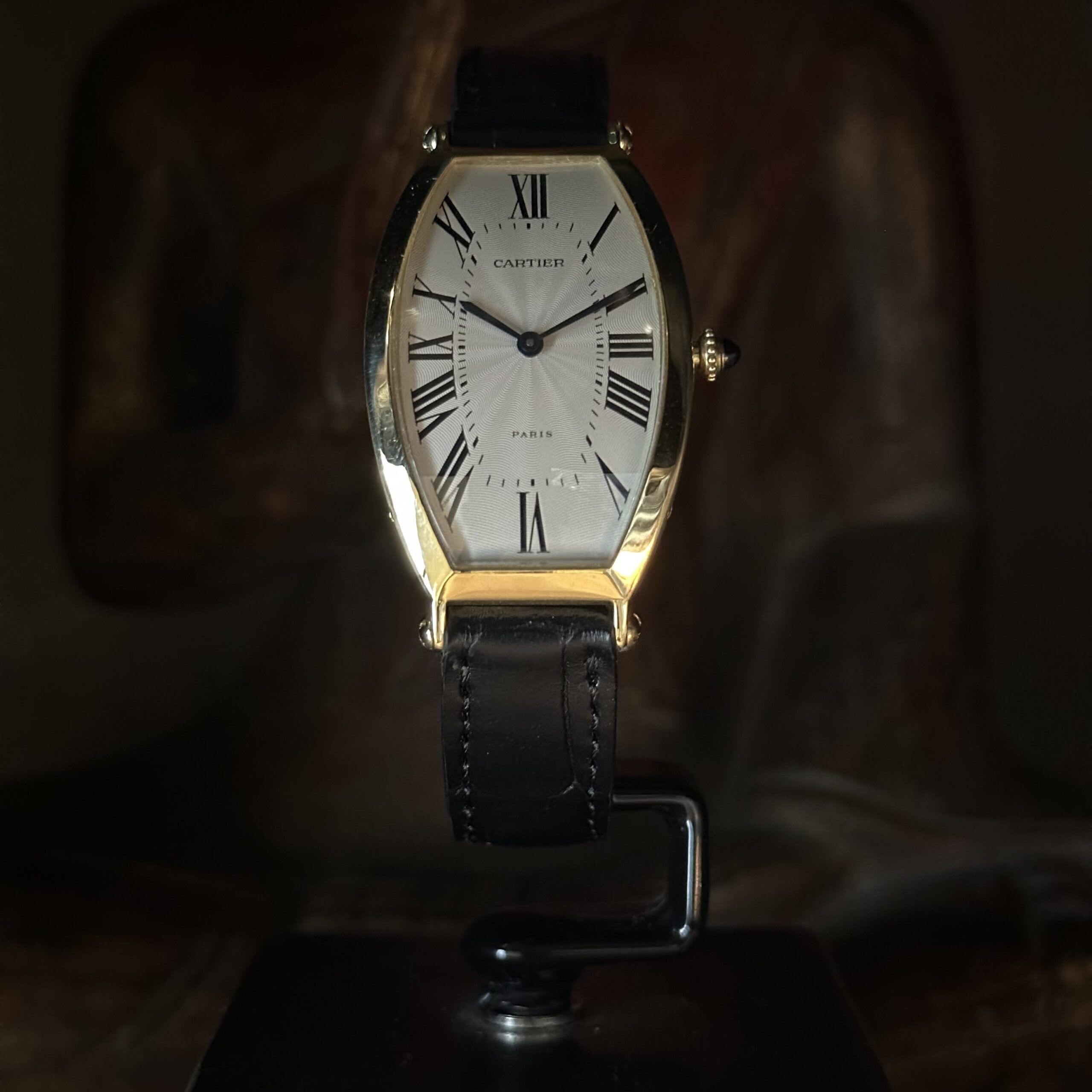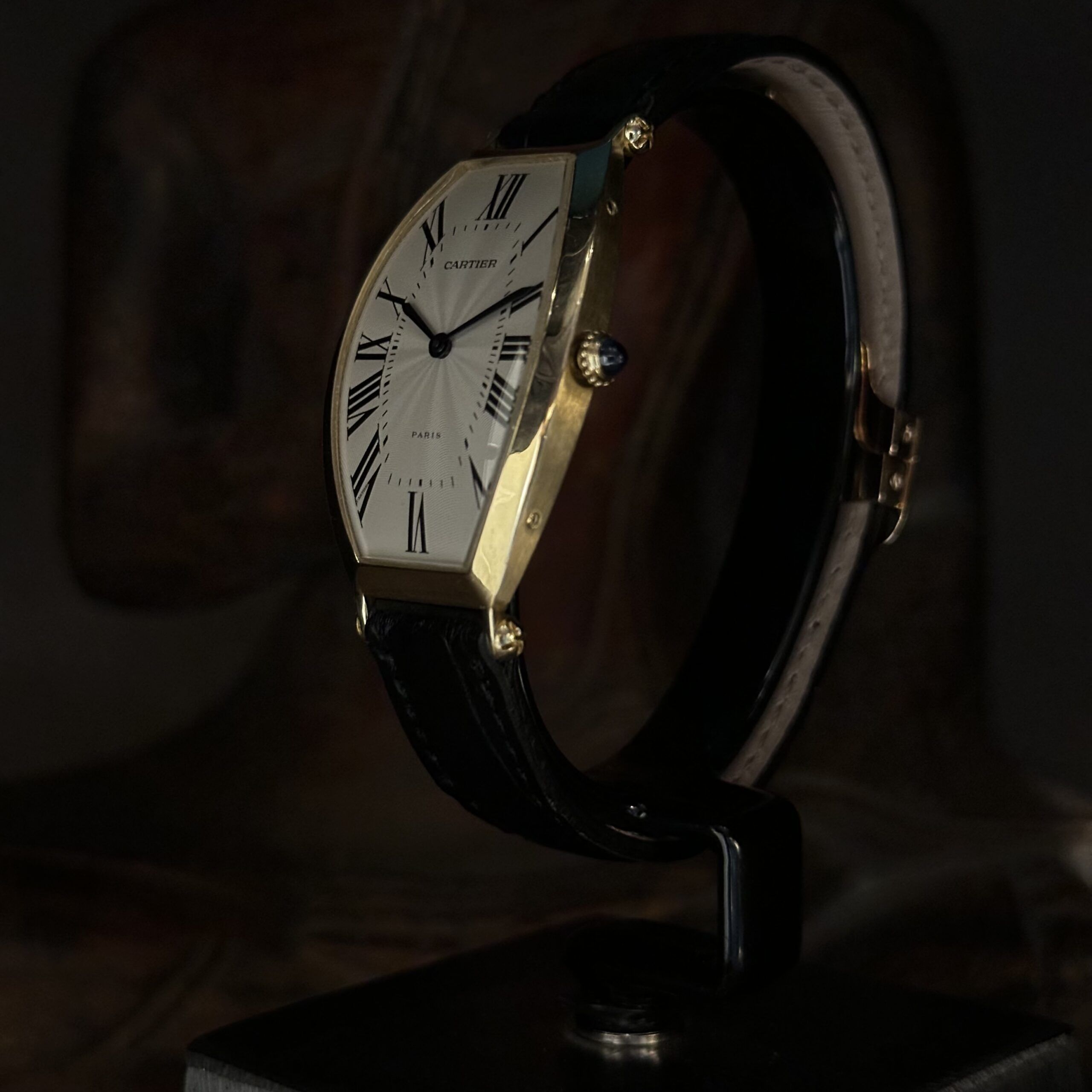Affascinante e raro Cartier Tonneau Paris, cassa in oro stondata, deployante in oro Cartier, bracciale in coccodrillo, particolare quadrante marchiato Paris, condizioni impeccabili, solo orologio e scatola.
