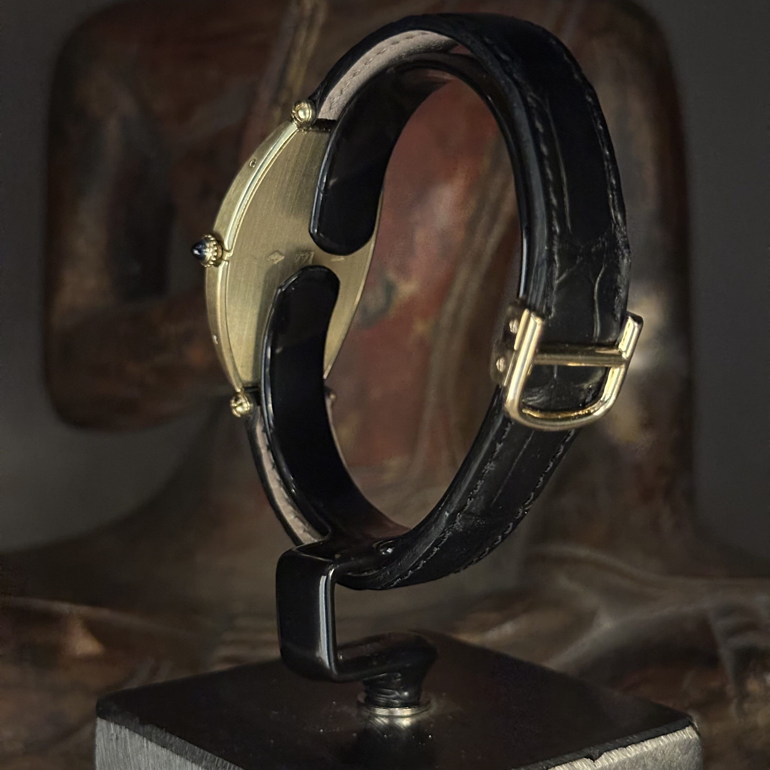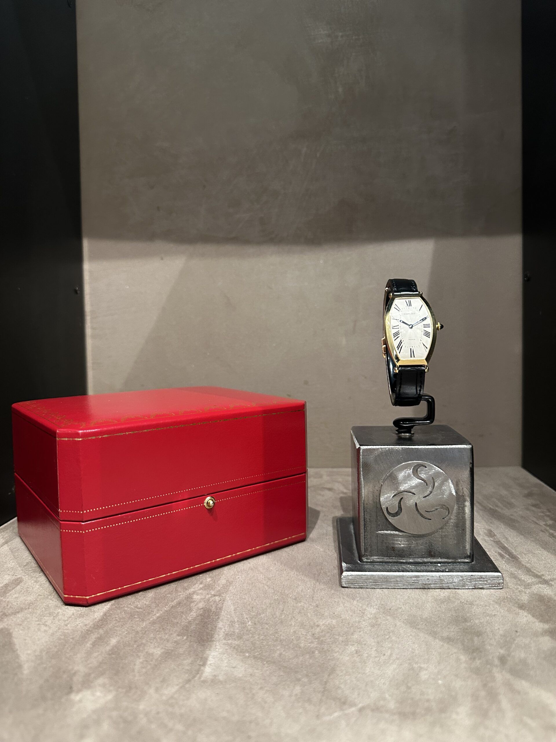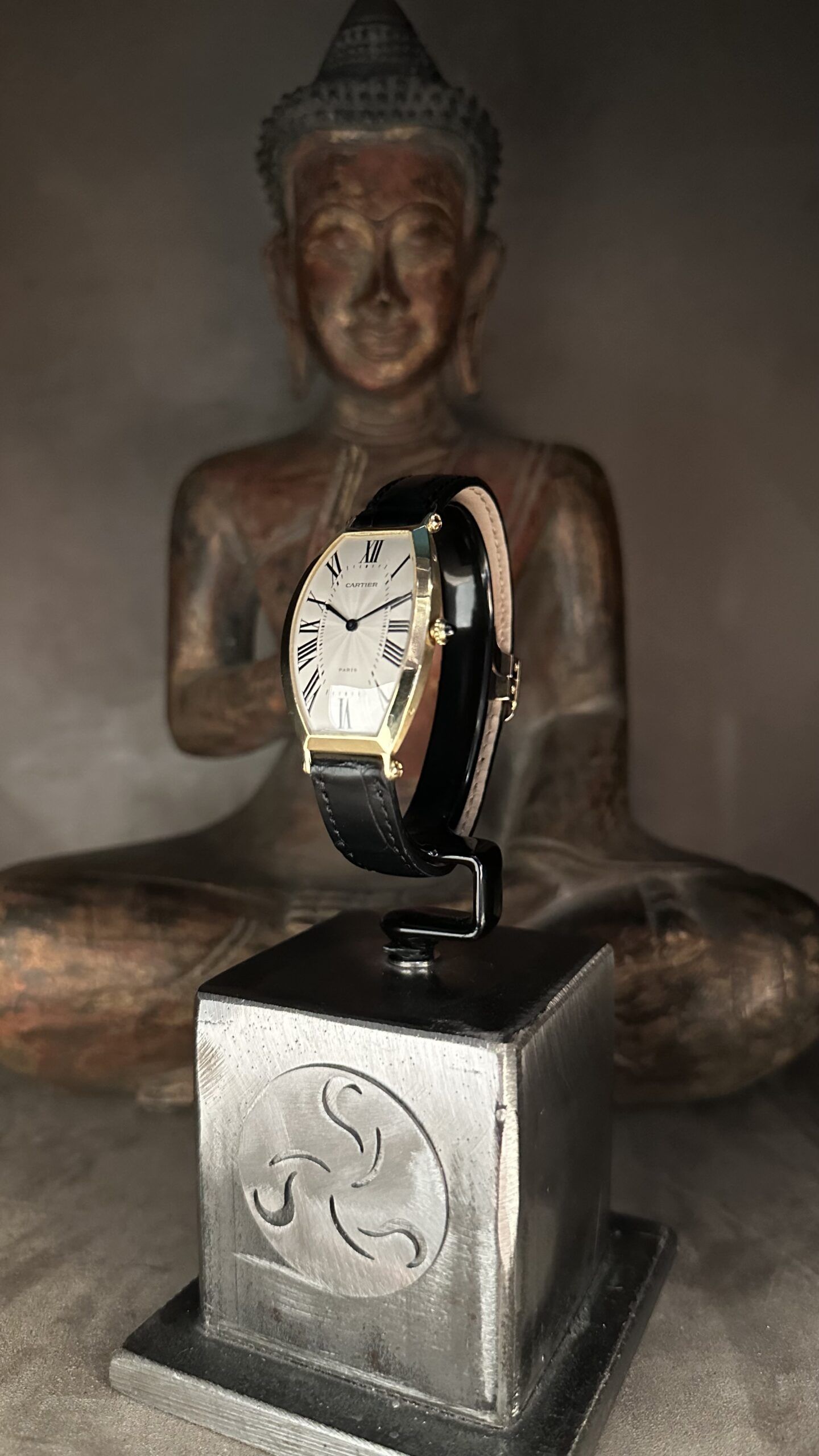Fascinating and rare Cartier Tonneau Paris, rounded gold case, Cartier gold deployant, crocodile bracelet, particular Paris-branded dial, impeccable condition, watch and box only.
