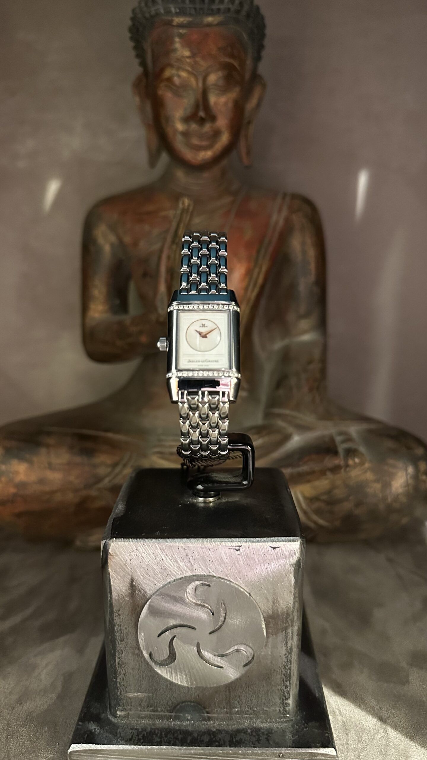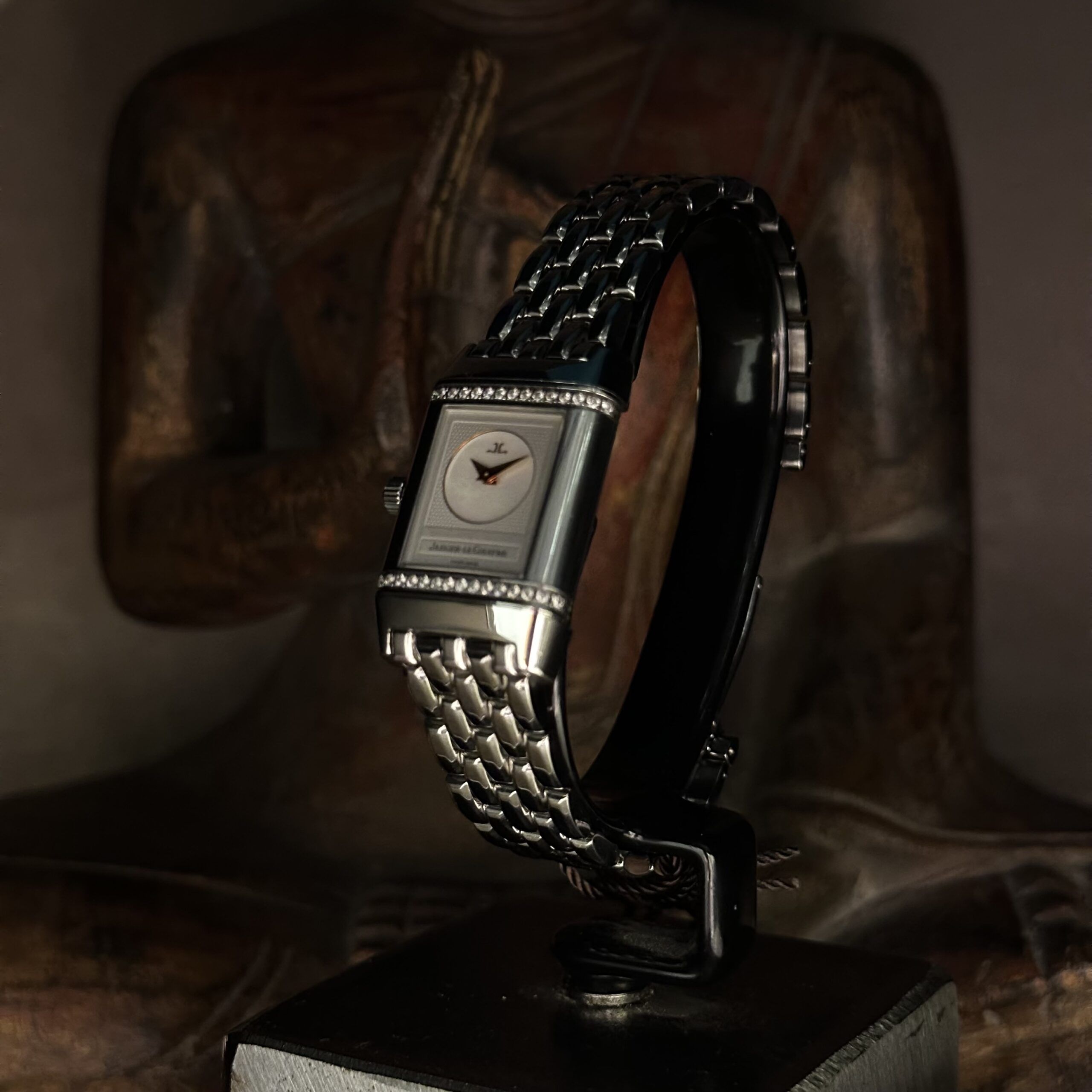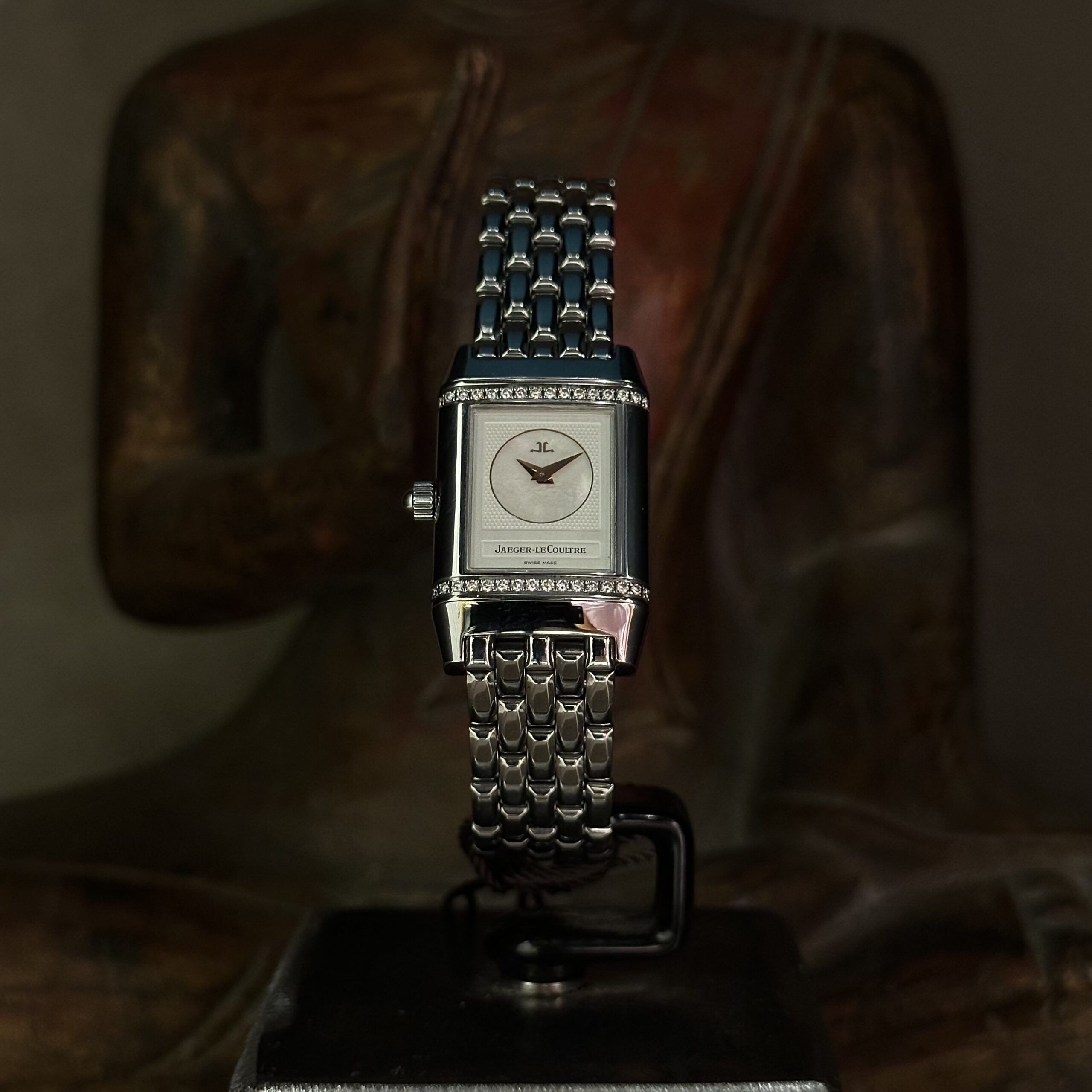 Stupendo Jaeger LeCoultre Reverso duetto, Ref. 266.8.44, movimento a carica manuale, doppio quadrante con diamanti, solo scatola.