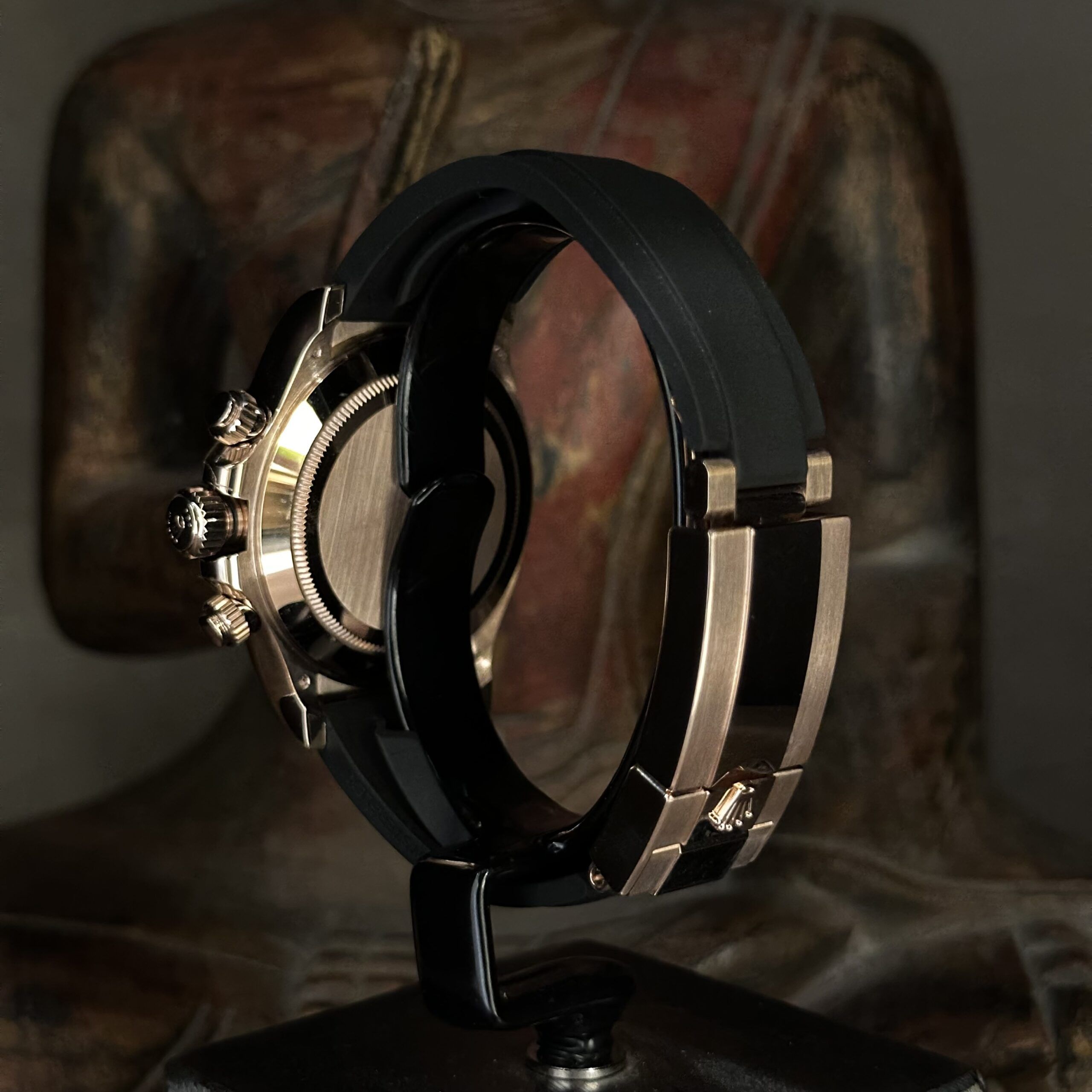 Fascinating Rolex Daytona Ref.116515LN, year 2022, new, never worn, rose gold, Rolex rubber oysterflex bracelet, Rolex deployant in rose gold, full set.